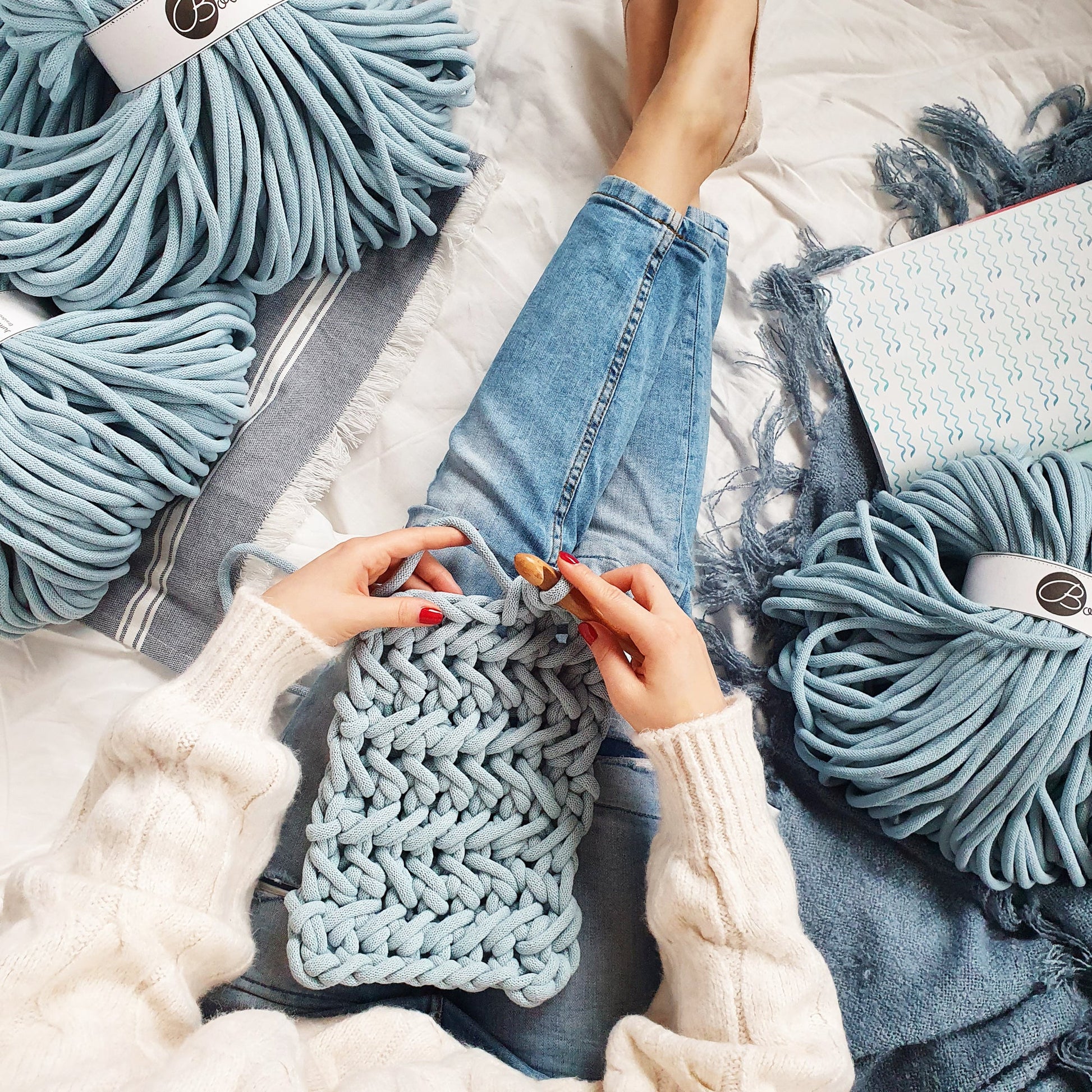 -des projets en crochet ou tricotage tels que paniers, tapis, poufs, sous-verres, etc…